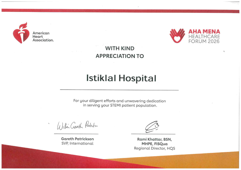 (AHA MENA Healthcare Forum 2026)، الذي أُقيم في مدينة دبي، كونه أول مستشفى في الاردن معتمد كمركز شامل لعلاج آلام الصدر بمشاركة نخبة من الخبراء والمؤسسات الصحية الدولية.