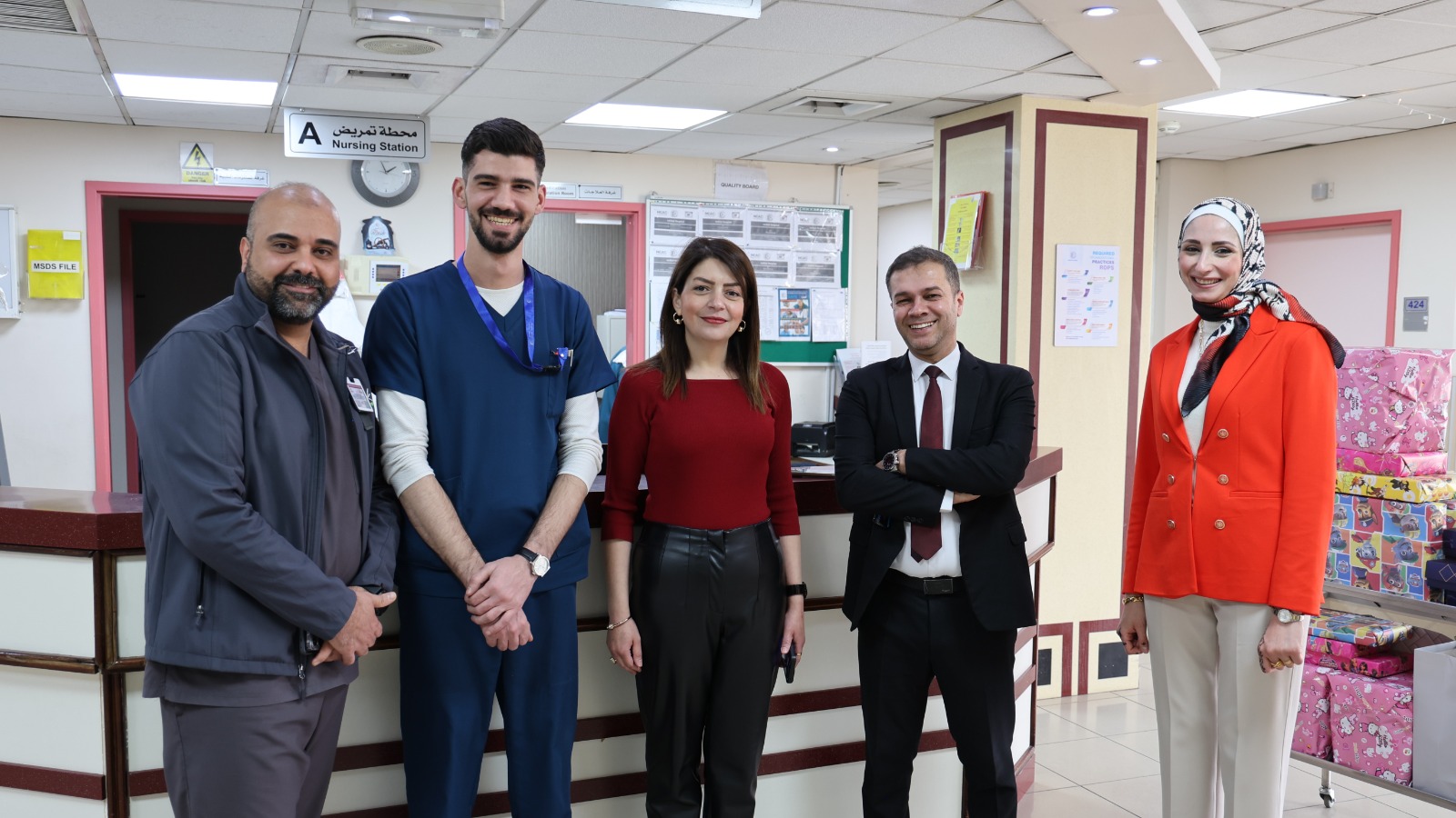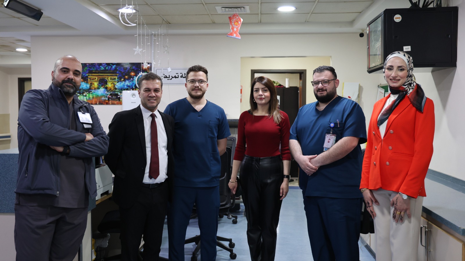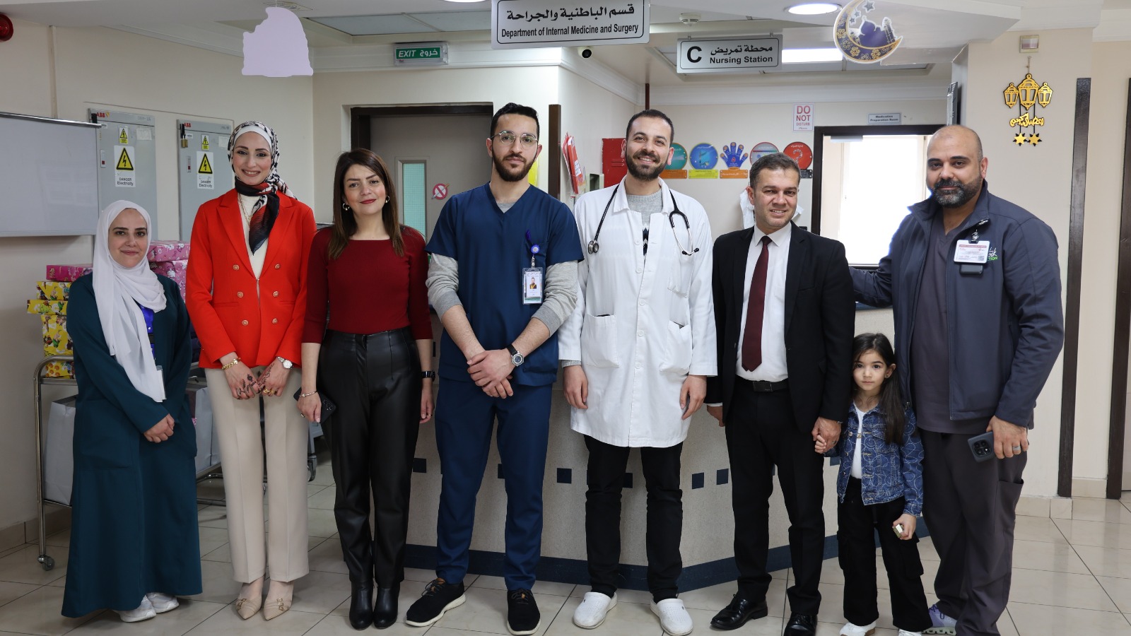 The Director of Al-Istiqlal Hospital, Dr. Moayad Omar, the Administrative Director Ms. Sarab Al-Hadidi, the Marketing and Public Relations Manager Ms. Sawsan Khattab, and the Administrative On-duty Omar Abu Naqeira extend their congratulations to all inpatients in the hospital and the staff performing their duties on the occasion of Eid Al-Fitr