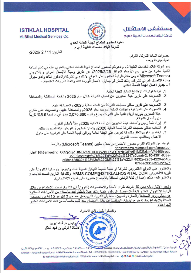 يسر شركة البلاد للخدمات الطبية ذ.م.م دعوتكم لحضور اجتماع الهيئة العامة العادي والمنوي عقده في تمام الساعة الثانية عشرة من ظهر يوم الأربعاء الموافق 25/2/2026م عن طريق وسيلة الاتٍّصال المرئي والإلكتروني (Microsoft Teams)، ومن خلال الرابط المنشور على الموقع الالكتروني للشركة والمذكور ادناه، والذي سيوفر وسيلة الاتصال المرئي للشركاء وذلك للنظر في جداول الاعمال الواردة ادناه واتخاذ القرارات المناسبة: -
